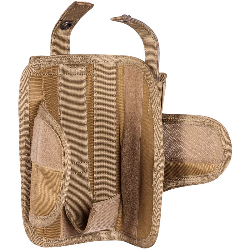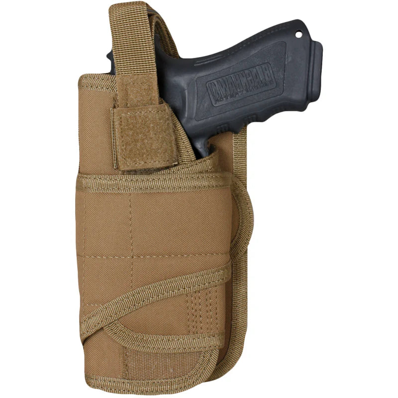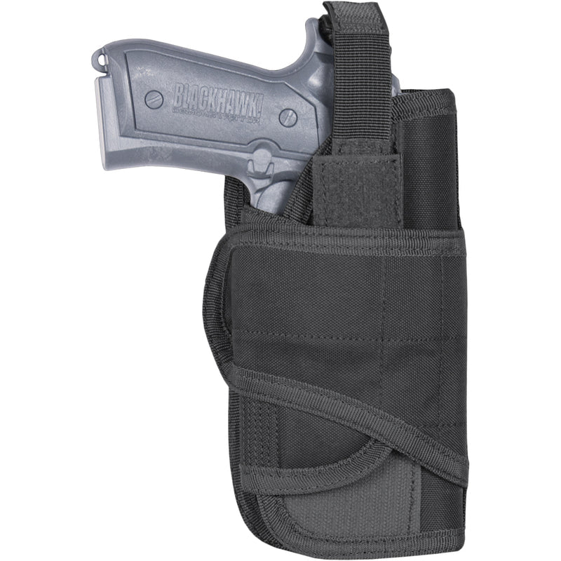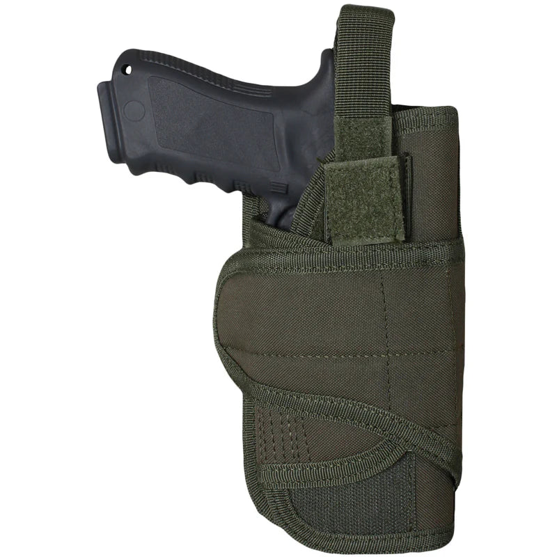 The Cyclone Vertical-Mount Modular Holster has a modular design which makes it easy to attach it to leg platforms, vests, belts, and any other product with modular webbing. It fits all large frame tactical pistols and pistols with flashlights or large laser mounts. It is made with a Level II thumb break security system. Available in both left-handed & right-handed versions.