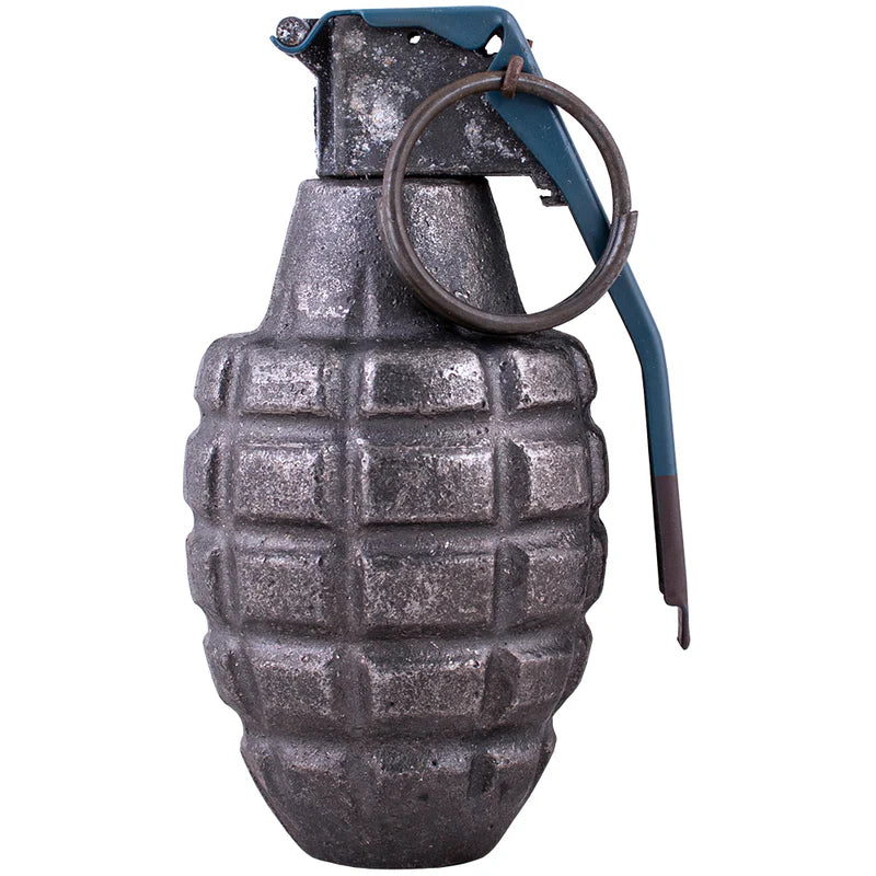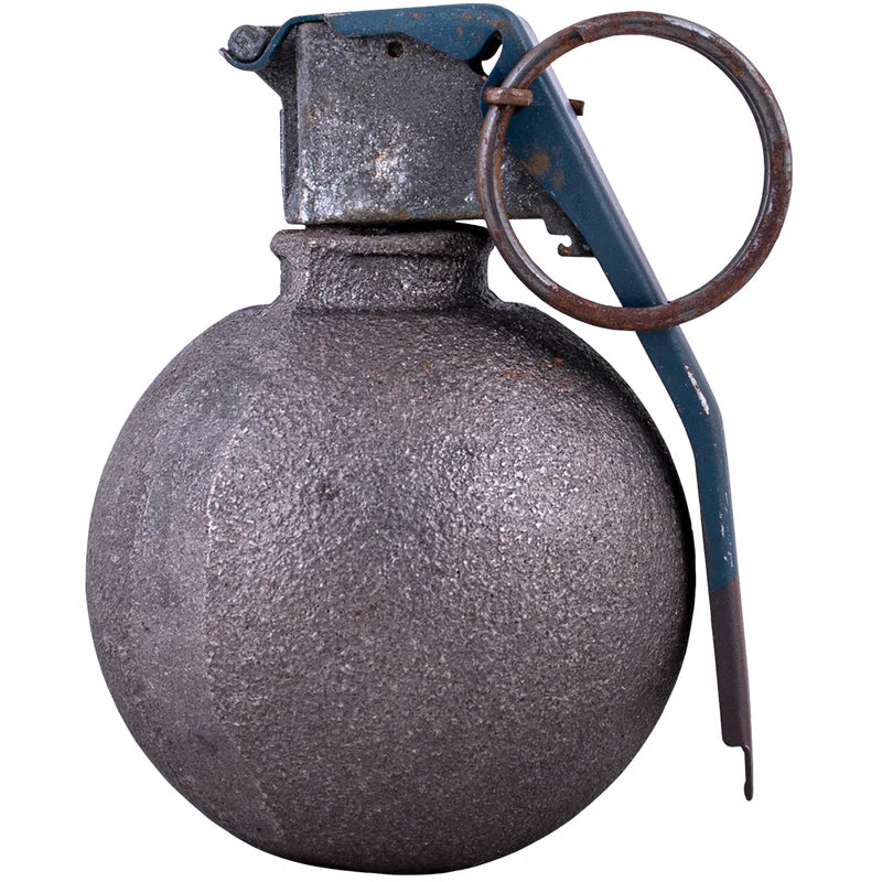 A novelty, WWII-replica, two-piece take-apart inert grenade made with forged metal parts and comes in three classic styles.
