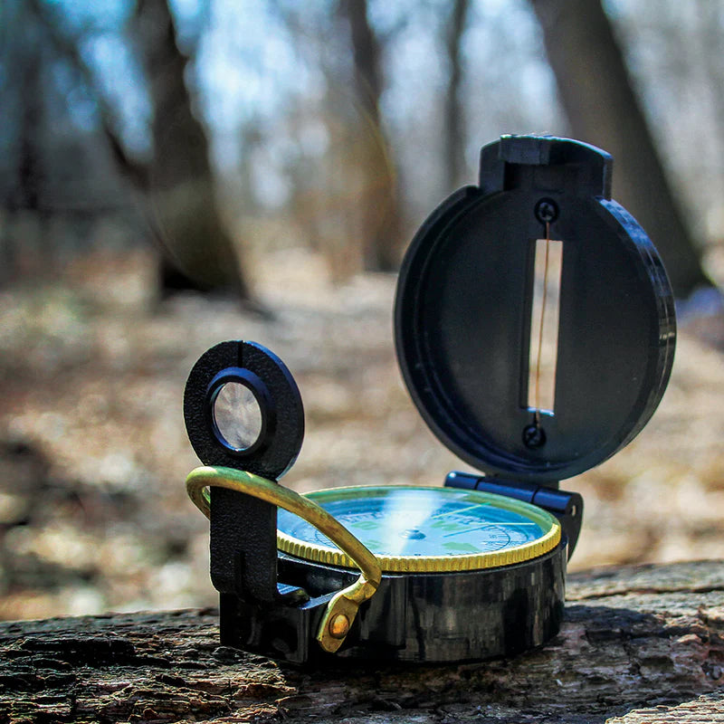 - To find your bearing in the field, hold the compass level in your hand so the graduated dial is free to rotate. Point the compass at the object you wish to take a bearing on. Align the object on the thin wire while looking through the sighting slot. Read the bearing through the eyepiece lens at the line of the travel indicator.