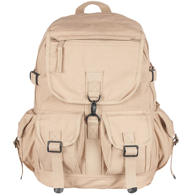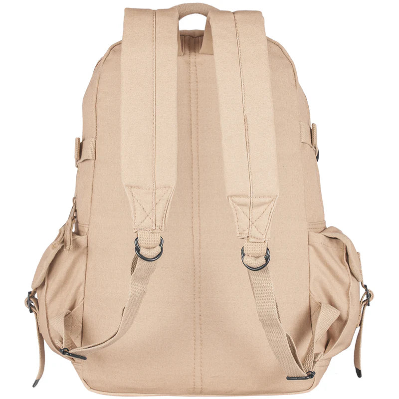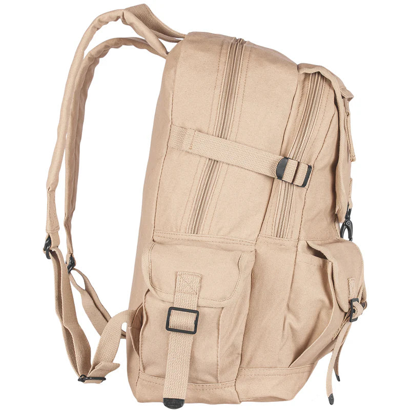 Our Retro Balkan Exploratory Rucksack is made of a color-washed canvas and features a large zippered main compartment, a front compartment under the flap with a clip closure, four exterior pockets with buckle closure, and fully adjustable backpack straps. A vintage-looking bag perfect for both day-to-day and outdoor excursions.