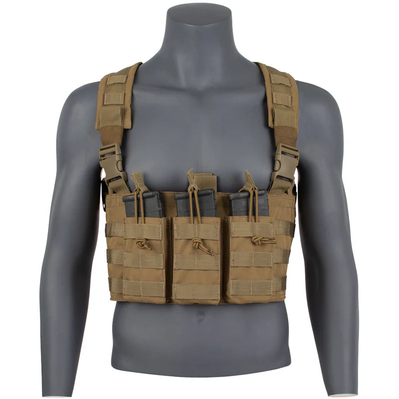 The Tactical Chest Rig is an easy-on/easy-off C.Q.B. rig that provides quick access to 3-30 round rifle magazines and has the option of attaching four additional modular pouches.